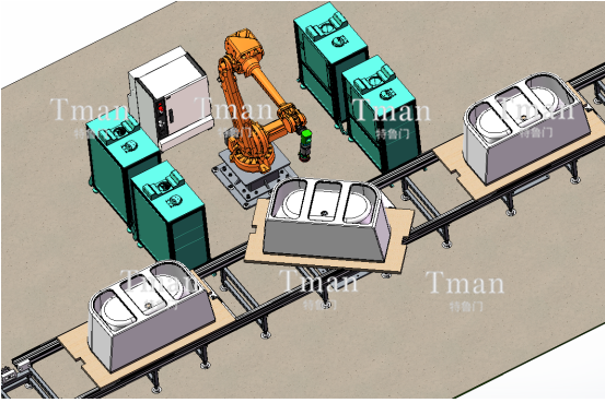 该设备由机器人、旋转顶升变位机、力控单元、浮动单元、自动换砂纸机构、打磨工具、胎具夹具、电控系统等构成。对浴缸进行全自动打磨,对浴缸表面腻子进行打磨,过程实现无人操作。