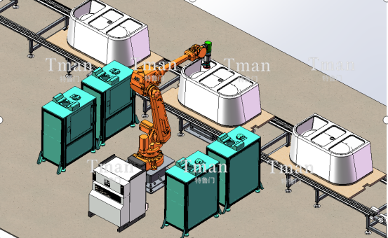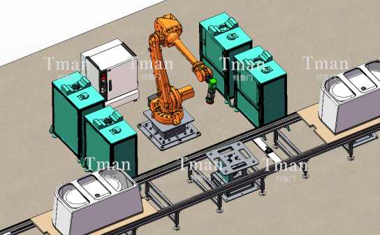 该设备由机器人、旋转顶升变位机、力控单元、浮动单元、自动换砂纸机构、打磨工具、胎具夹具、电控系统等构成。对浴缸进行全自动打磨,对浴缸表面腻子进行打磨,过程实现无人操作。