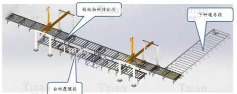 整体设备是由栈板物料传输段和自动缠膜线、下料缓存段及电气系统构成。