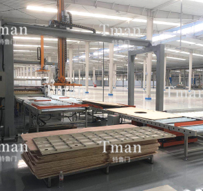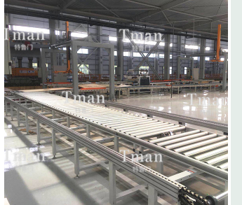 工艺流程:叉车移入产品-产品自动流入移载机-移载取板-产品定位自动进入覆膜机-自动覆膜后流入移载机-自动堆垛-顶升转向-进入缓冲区(10米长)-自动流入阻挡位置。